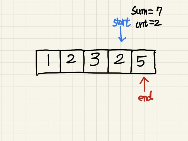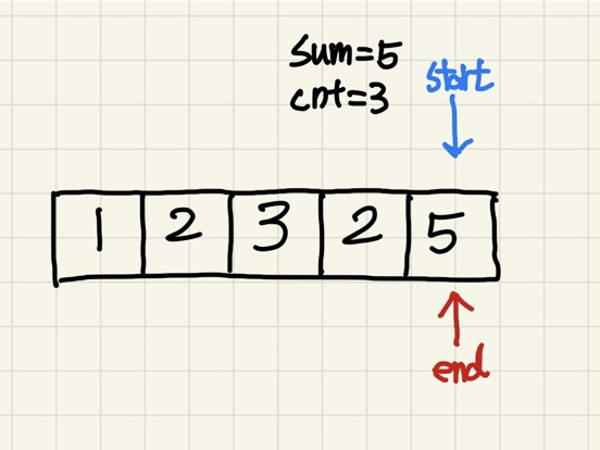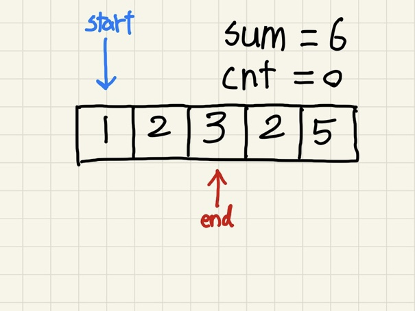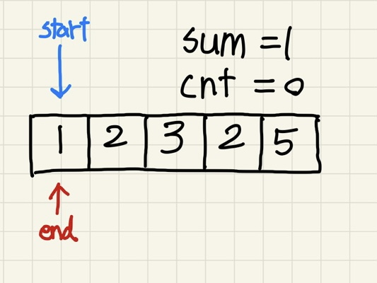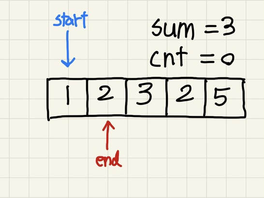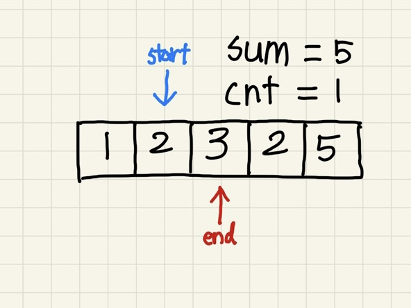sum의 값이 5와 같아져서 cnt를 1 올려주고, start와 end를 둘 다 올려준다.